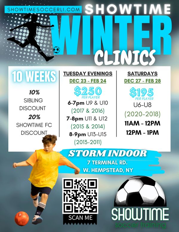 Ready to level up this Winter? Our U6–U15 programs pack 10×60-minute sessions into a fast, fun, and competitive environment at Storm Academy: 7 Terminal Rd, West Hempstead. Each session is built to improve footskills, fitness, and confidence with speed & agility drills and small sided games. Sibling (10%) and Showtime FC (20%) discounts available—email brian@showtimesoccerli.com for a code.