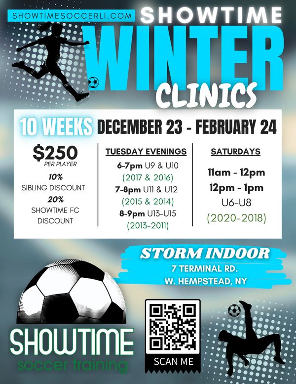 Ready to level up this Winter? Our U6–U15 programs pack 10×60-minute sessions into a fast, fun, and competitive environment at Storm Academy: 7 Terminal Rd, West Hempstead. It’s $250 per player and built to improve footskills, fitness, and confidence with speed & agility drills and small sided games. Sibling (10%) and Showtime FC (20%) discounts available—email brian@showtimesoccerli.com for a code.